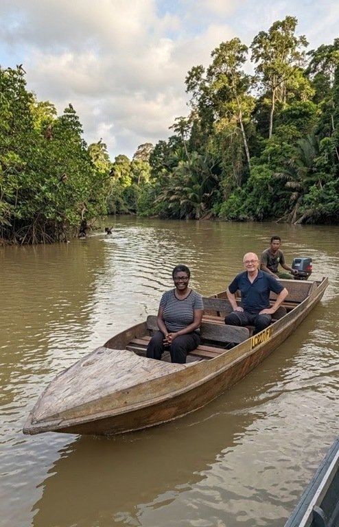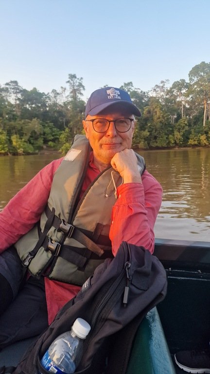 De foto met ons beiden in de boot is AI-gegenereerd. De bewuste boot vaart niet langer en staat ten toon in Sukau lodge aan de Kinabatangan rivier. Dit is de boot waarin David Attenborough zat tijdens een van zijn expedities op Borneo.